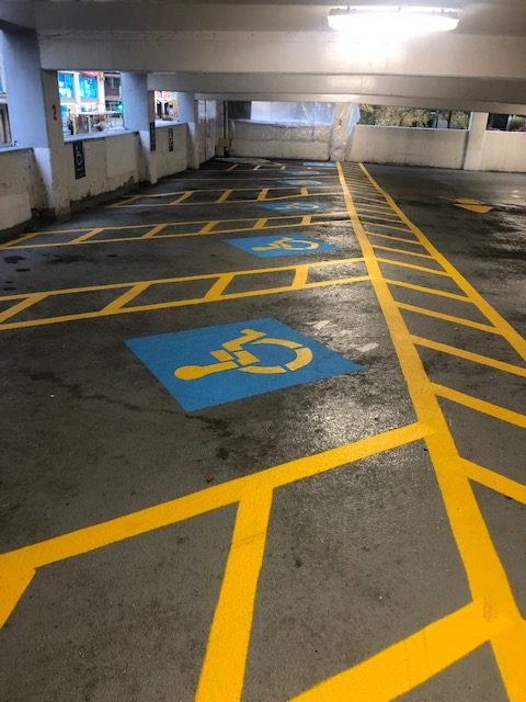 Line Striping & traffic markings – Parking garages are some of the most efficiently designed structures. They are built to use every square inch of area. It keeps incoming traffic going in one direction and exiting traffic going in another direction. In between are well laid out parking stalls | handicap stalls | directional arrows | fire lanes | no parking areas | reserved sections | crosswalks | and numbered or identified parking spaces | If you cannot see these paint markings it leaves your garage at high risks for accidents, and may take away from utilizing the stalls for greater capacity. We will line stripe your garage using solvent based traffic paint that is crisp/ bright and very durable. We can make any corrections needed to update your parking garage to any new building codes. Â We will paint everything the colors of your choice, white and yellow are usually the standard colors for stalls, arrows, and misc markings but we can use any colors desired to mark off specific areas. Our Parking garage painters will go the extra mile to make sure your garage looks great while properly functioning and remaining safe.Â