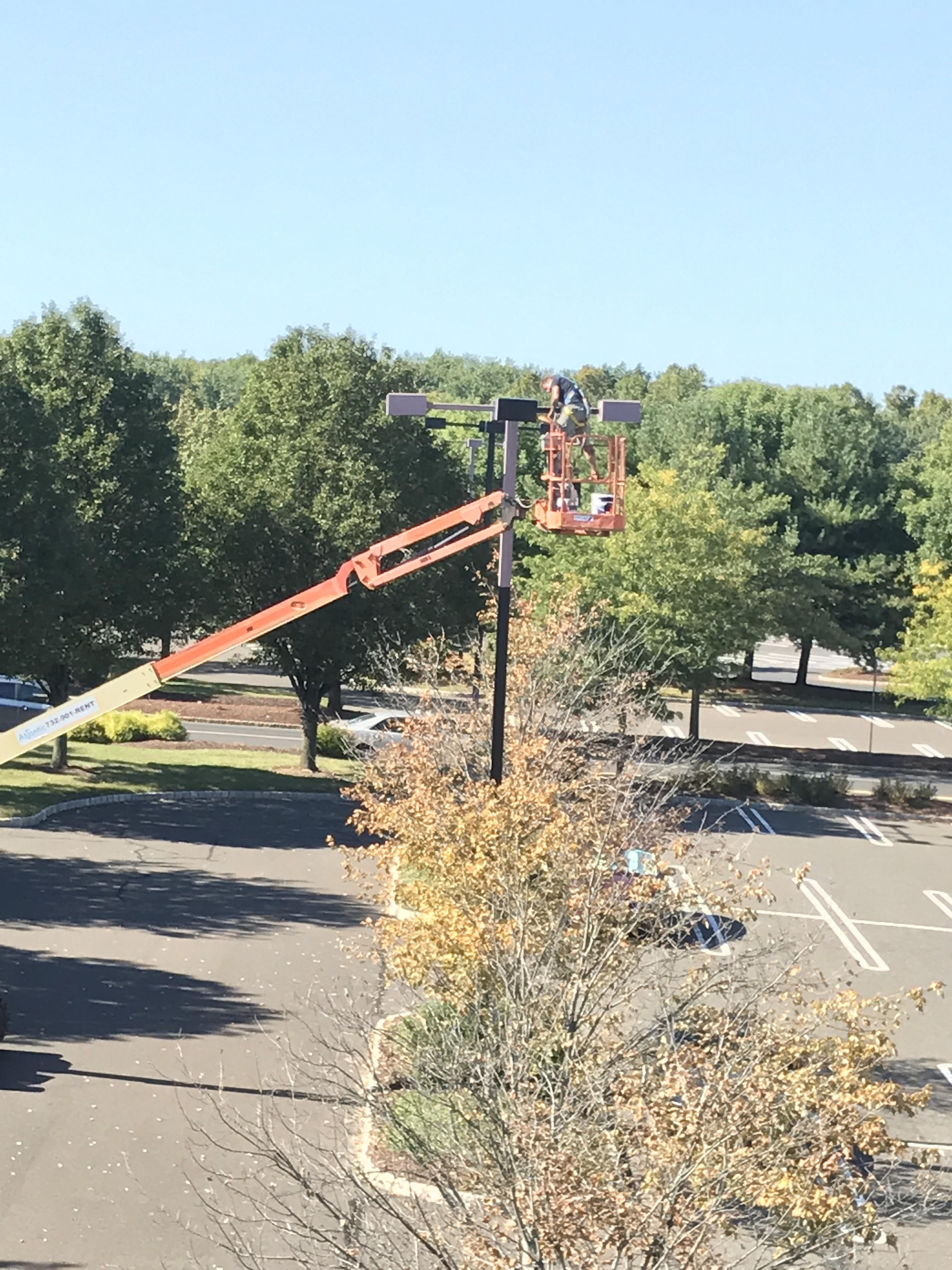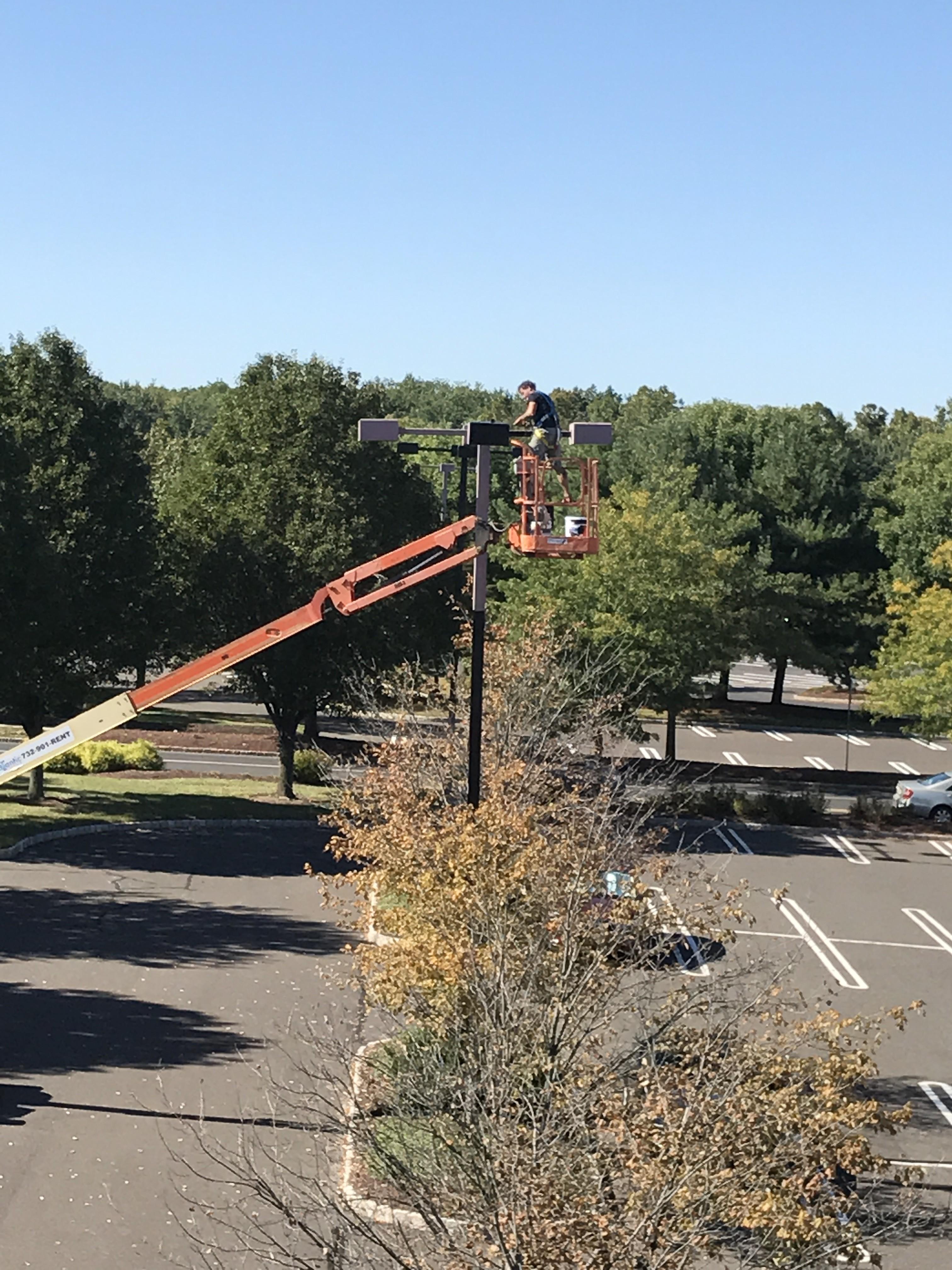 Light Pole Painting – Retail Store Painting LLC. provides all types of parking lot services. We can / refinish your light poles / road signs / and highway signs of any size or height. We can lineStripe your parking lot / paint your curbs / repaint the exterior of your building / and make your property always look its best with maintenance services. / Pictured in this page is a light pole painting project in Princeton, NJ. where we painted over 300 light poles, and decorative poles throughout the property. We sanded all the rust areas and applied a rust inhibitive primer. We then applied 2 coats of Sherwin Williams DTM (direct to metal ) 100% acrylic paint to all the light poles. To reach all sides of the poles we used 40 ft arial boom lifts. Please call us for a free estimate at 1-800-538-6723. You can also check out our full website at RetailStorePainting.com.