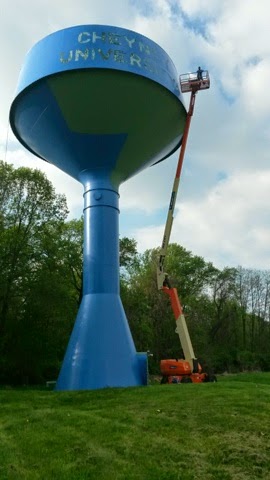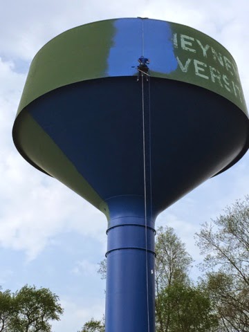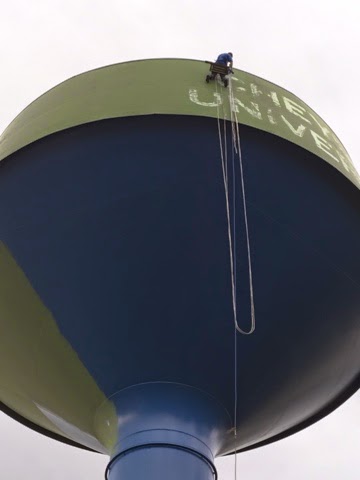 When painting a water tower you run into different situations where you may need several types of specialty equipment to access the entire tower.  In this particular location the use of a bolsum chair, and an 80 ft aerial boom lift was needed.  All the rust had to be scraped, grinded and completely primered before the topcoats were applied. After the whole tower was painted we re-applied the lettering.